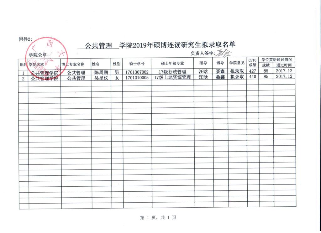 金沙赌场网站 2019年硕博连读研究生拟录取名单公示