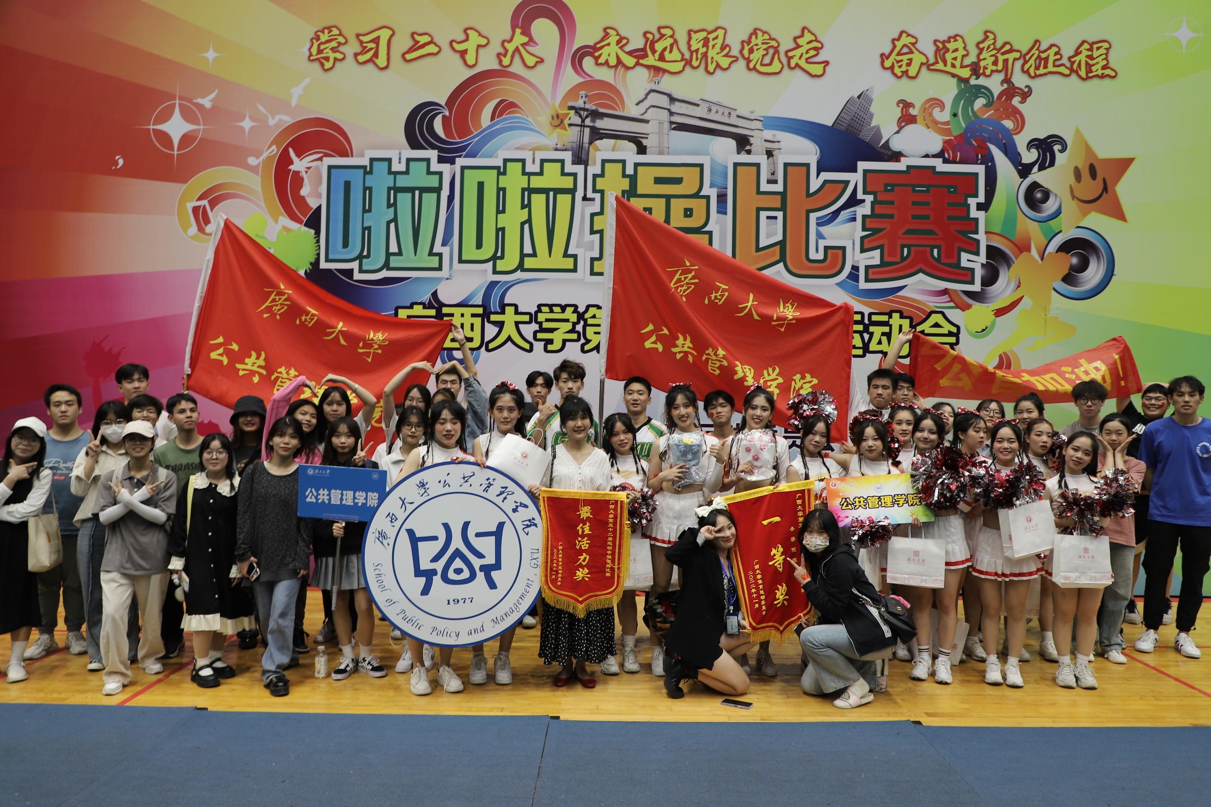11月6日下午,广西大学第五十二届运动会啦啦操比赛于西综合体育馆拉开比赛序幕,分为大金沙赌场网站 组和小金沙赌场网站 组,金沙赌场网站 代表队带着一支《Lucky Strike》闪亮登场,最终以512分的成绩征服全场,荣获小金沙赌场网站 组“一等奖”和“最佳活力奖”。