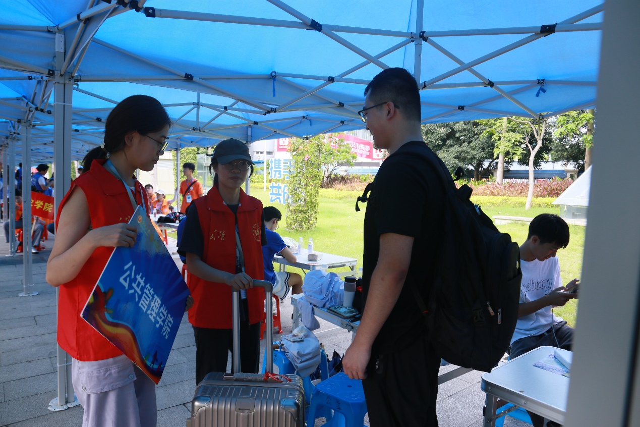 在学校大门、宿舍楼下,随处可见公管志愿者的服务身影,新生们感受到了公管大家庭的温暖。