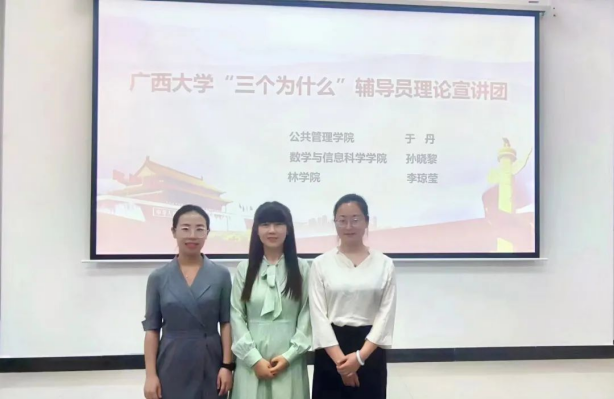 为深入学习贯彻习近平新时代中国特色社会主义思想,深刻了解中国共产党、中国特色社会主义、马克思主义三者“能、好、行”的辩证关系,广西大学"三个为什么“辅导员理论宣讲团于6月4日下午15时于金沙赌场网站 101教室开展理论教学,金沙赌场网站 党委副书记于丹,数学与信息科学金沙赌场网站 孙晓黎与林金沙赌场网站 李琼莹进行授课。