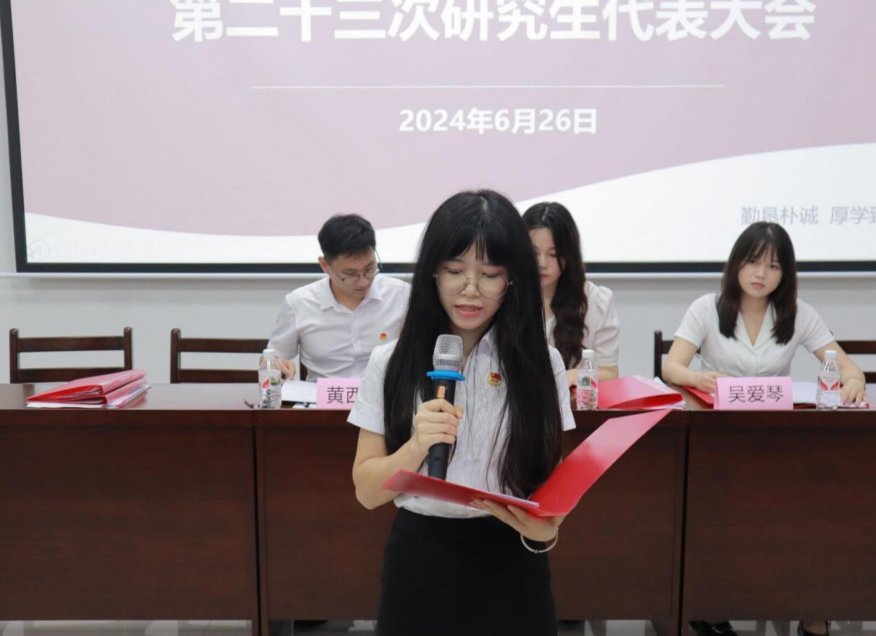 院团委书记刘佩瑶在致辞中表示,本次大会是焕发着青春风采、激昂着奋发斗志的盛会,不仅是金沙赌场网站 广大研究生同学民主政治生活中的重要时刻,更是金沙赌场网站 研究生工作承古拓新、迈向卓越的新篇章。接着,她围绕思想政治“引领力”、改革创新“推动力”、服务同学“支持力”和文化建设“感染力”等四个方面汇报了金沙赌场网站 研究生会的工作进展和成果。