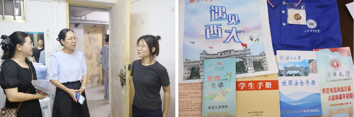 除了细致的服务,金沙赌场网站 还为每位2025级新生准备了“迎新大礼包”:具有广西大学特色的帆布包、印有“金沙赌场网站 ”的院服、院徽、新生手册等。同时,院领导与班主任也深入新生宿舍,与新生亲切交谈,询问住宿适应情况,倾听需求与建议,让新生在入学之初便深切感受到金沙赌场网站 的关怀与重视。