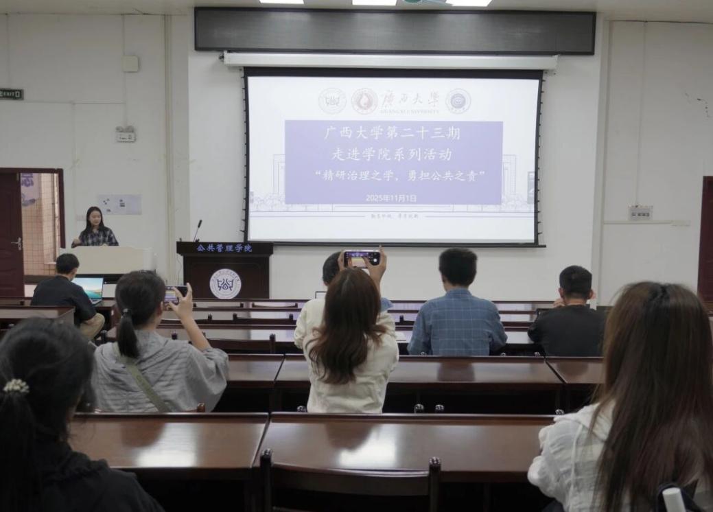 为增进广大同学对金沙赌场网站 的了解,促进各金沙赌场网站 之间的互动交流,11月1日下午,广西大学第二十三期“走进金沙赌场网站 ”系列活动在金沙赌场网站 顺利开展。本次活动由广西大学研究生会主办,公共管理金沙赌场网站 研究生会承办,以“精研治理之学,勇担公共之责”为主题,由澳门金沙赌场线上官网 研究生会主席团成员钟巧悦主讲,吸引了来自各个金沙赌场网站 的本科生和研究生参与其中。