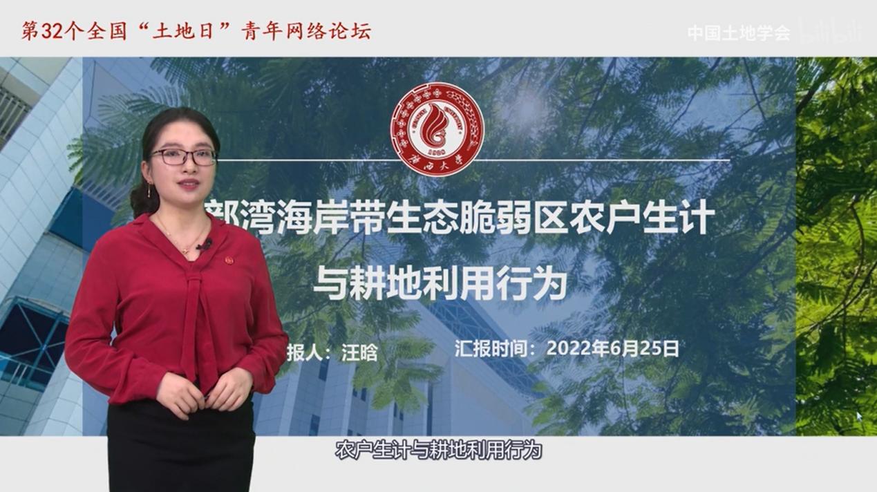 本次论坛邀请了15位土地科学青年科技工作者,他们当中既有来自研究机构、大专院校的学术新星,也有奋战在实践一线单位的技术骨干,通过视频录制、PPT讲解等多种形式,发表学术观点和政策建议,探讨节约集约用地与耕地保护议题。金沙赌场网站 汪晗副教授在专栏二——粮食安全与耕地资源保护中,做了题为“北部湾海岸带生态脆弱区农户生计与耕地利用行为”的主题报告,为全力构建耕地保护和节约集约用地新格局建言献策。