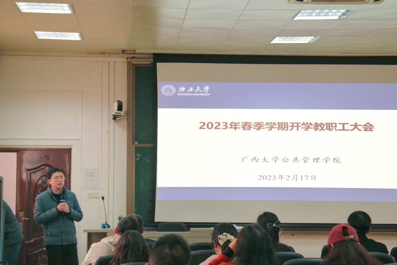 会上,首先由史云贵院长作开学工作讲话。他首先肯定了2022年全体教职工戮力同心,共同努力取得的成绩。同时指出2023年金沙赌场网站 发展的工作思路,从金沙赌场网站 班子的分工、院系调整、科研成果评价、金沙赌场网站 资源的整合与盘活、金沙赌场网站 空间布局规划等十个方面作新学期重点工作布置。史院长表示,2023年是金沙赌场网站 全面贯彻党的二十大精神、金沙赌场网站 全面提速发展关键之年,全体教职工要凝心聚力、振奋精神、锐意进取,全力推动金沙赌场网站 高质量发展。会上金沙赌场网站 领导班子结合分管工作,结合学校相关的会议精神和金沙赌场网站 的发展定位及创新路径,对新学期工作提出了部署安排。
