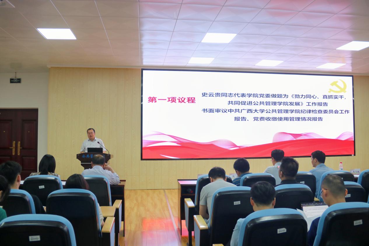 大会在国歌声中拉开帷幕。院党委副书记、院长史云贵代表金沙赌场网站 党委作题为《勠力同心、真抓实干,共同促进金沙赌场网站 发展》的报告,报告从基层党建、学科建设、人才培养、科学研究等方面全面回顾金沙赌场网站 党委过去五年的工作。五年来,金沙赌场网站 党委紧紧围绕学校中心工作,加快推进金沙赌场网站 和学科高质量发展。金沙赌场网站 获批首批新时代广西高校党建工作标杆院系,基层党建“作业本”运行机制获得学校和自治区主管部门的高度认可;在院系结构上,打造了“四系-两院-一中心”的金沙赌场网站 治理结构;在学科特色品牌建设上,打造了西大公共管理学科的“绿色”品牌,在学界具有了一定的影响力。