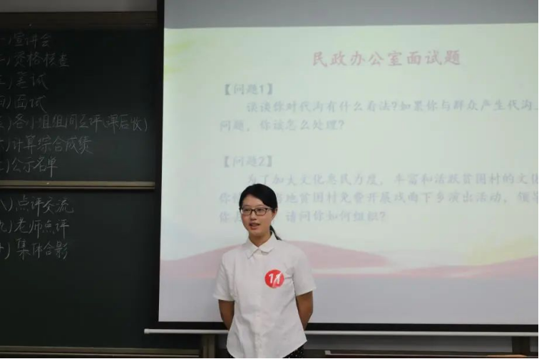 为帮助金沙赌场网站 学生了解定向选调生的选拔标准与考核流程,将公共部门人力资源管理理论与定向选调选拔实际操作相结合,11月15日早上8:00至9:40,在第六教学楼114教室举行定向选调生模拟招聘会活动。本次活动是李国梁主讲课程《公共部门人力资源管理》的创新呈现形式。公共事业管理2022级3班全部成员参与到本次选调生招聘会活动中。
