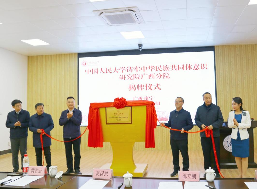 最后,夏国恩副校长、黄青云处长、陈立鹏副院长、吴达慧副书记、聂鑫书记、李光辉院长共同为中国人民大学铸牢中华民族共同体意识研究院广西分院揭牌。