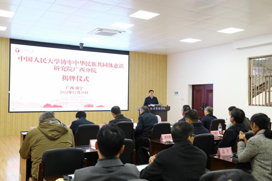 12月30日下午,中国人民大学铸牢中华民族共同体意识研究院广西分院揭牌仪式于澳门金沙赌场线上官网 隆重举行。广西大学党委常委、副校长夏国恩,中国人民大学铸牢中华民族共同体意识研究院副院长陈立鹏,自治区教育厅科研管理处处长黄青云,广西大学经济金沙赌场网站 学术院长李光辉,广西大学马克思主义金沙赌场网站 常务副书记吴达慧以及广西大学多个金沙赌场网站 代表出席了揭牌仪式。仪式由科研院副院长李海波主持。