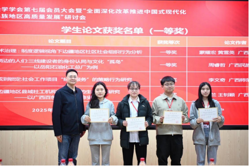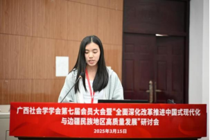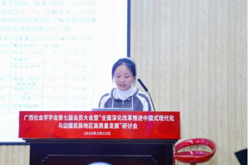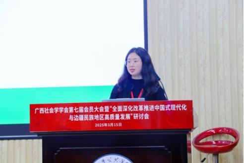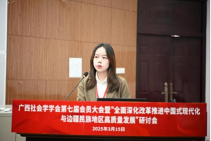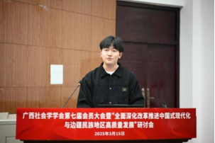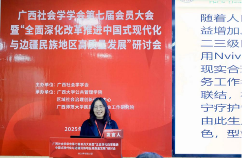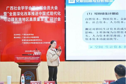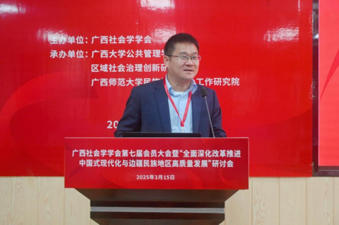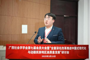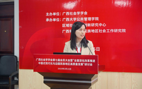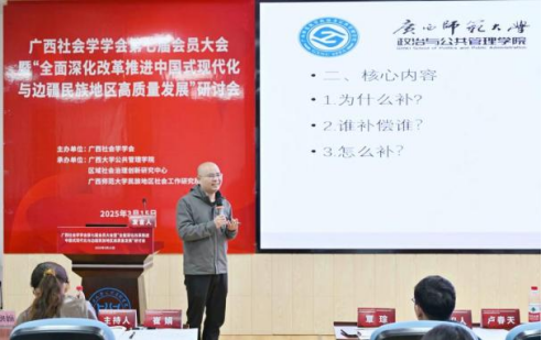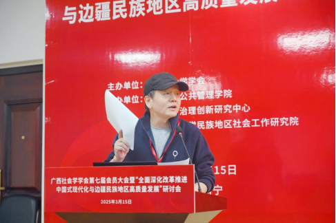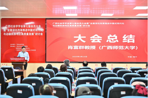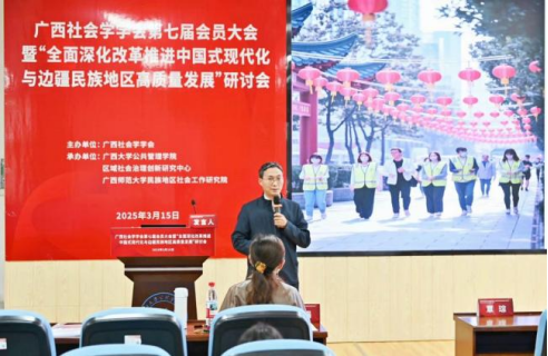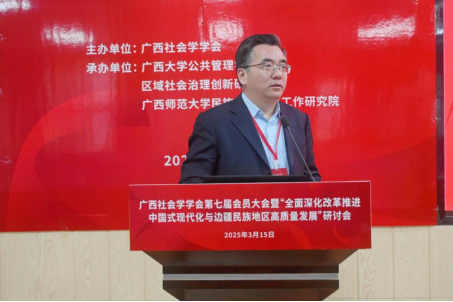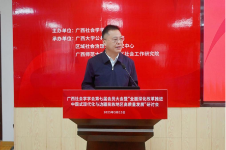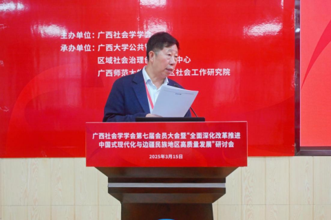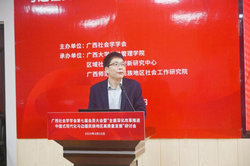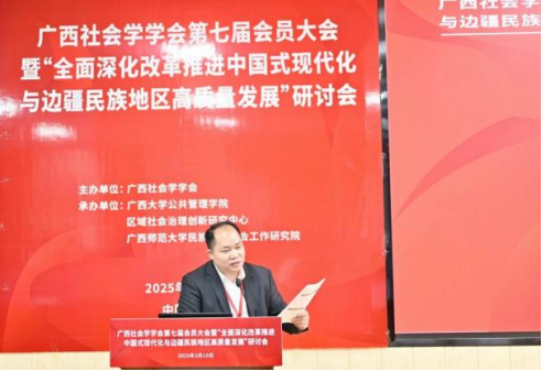2025年3月15日,广西社会学学会第七届会员大会暨“全面深化改革推进中国式现代化与边疆民族地区高质量发展”研讨会在广西大学成功举办。活动由广西社会学学会主办,澳门金沙赌场线上官网 、区域社会治理创新研究中心、广西师范大学民族地区社会工作研究院联合承办,得到了广西人文社会科学重点研究基地西部城乡融合发展研究院的支持。