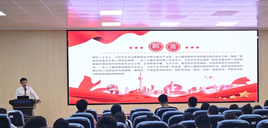 为深入贯彻落实全面从严治党要求,进一步加强党的作风建设,5月28日下午,金沙赌场网站 党委书记聂鑫在203教室为学生党员代表讲授深入贯彻中央八项规定精神学习教育专题党课。