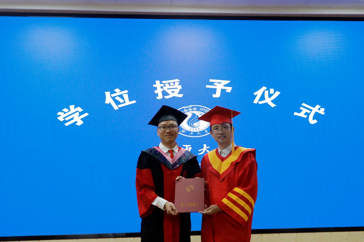 进入学位授予仪式环节,副院长周均旭宣读学位授予决定后,本科生、学术型硕士及博士生毕业生按顺序依次上台接受学位授予。院党委书记聂鑫为获得学位的毕业生行拨穗礼并授予学位证书、合影留念。