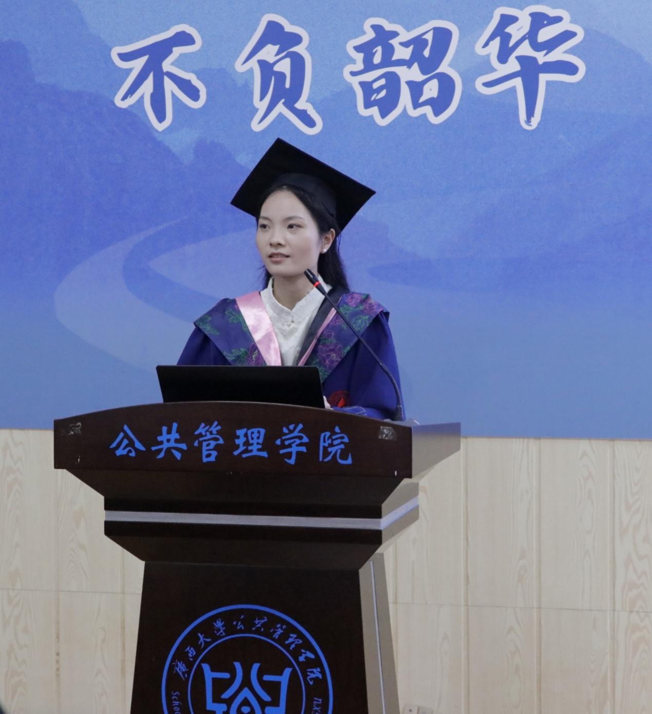本科生代表陈律铭对他的四年学习生涯进行回望,展现出公管学子向下深扎实根,在火热实践中锤炼实干本领;向上奋力生长,与新时代同向同行的良好精神风貌。他呼吁毕业生们立报国强国大志向,做挺膺担当奋斗者,以青春、奋斗之我为强国建设和民族复兴伟业贡献青春力量。