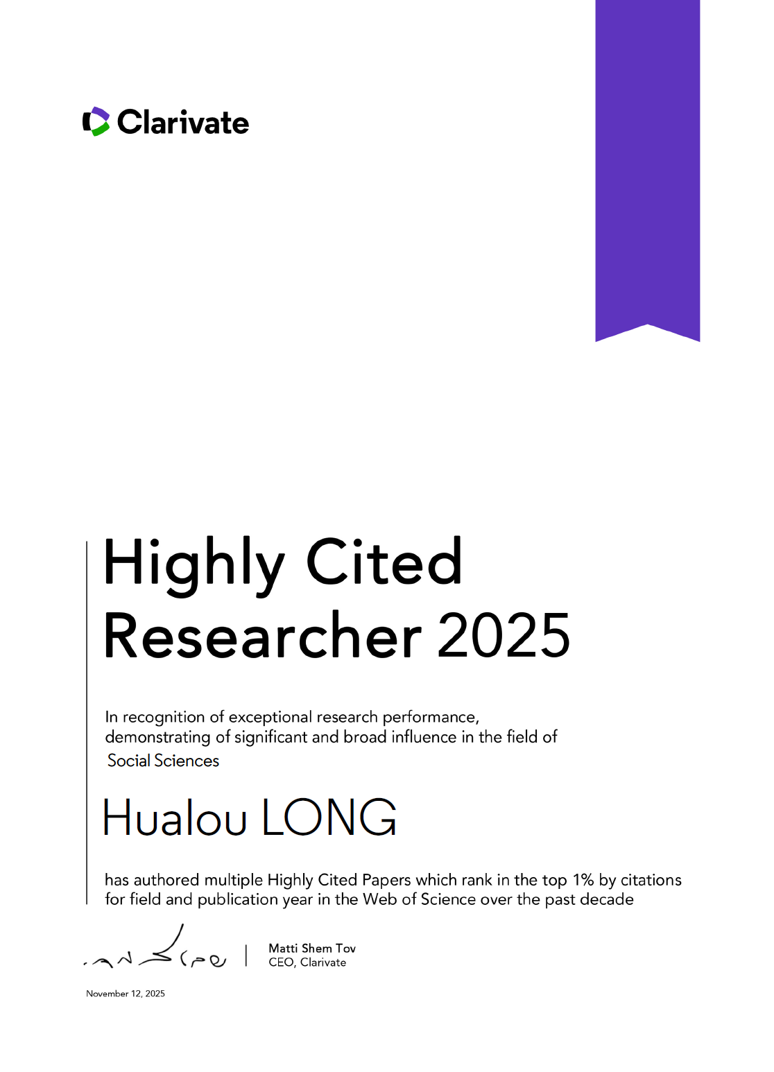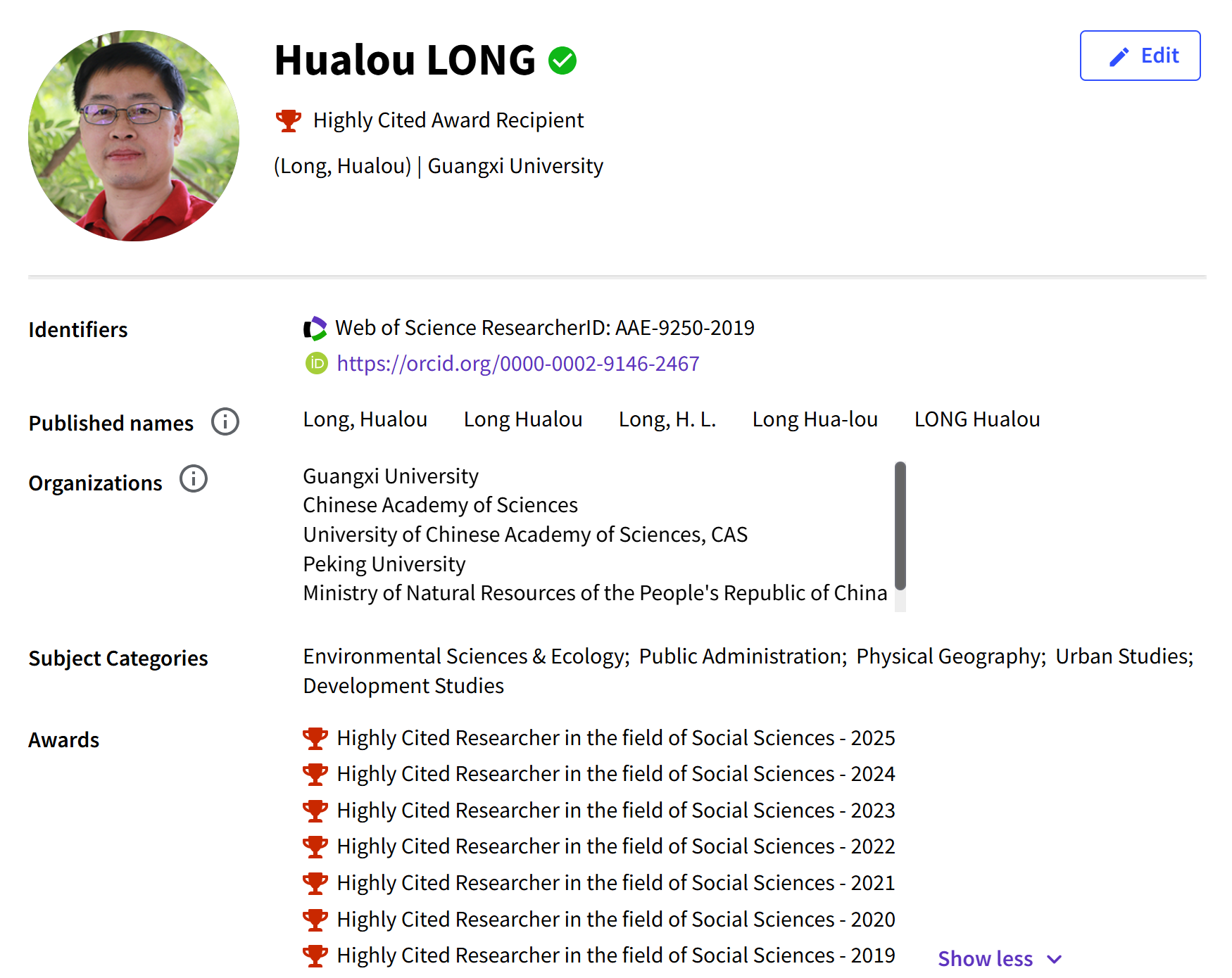 继2019年入选该榜单以来,金沙赌场网站 土地资源管理系龙花楼教授再度连续入选社会科学(Social Sciences)领域的全球“高被引科学家”。2025年榜单中,龙花楼教授是广西大学在该榜单中唯一入选者。