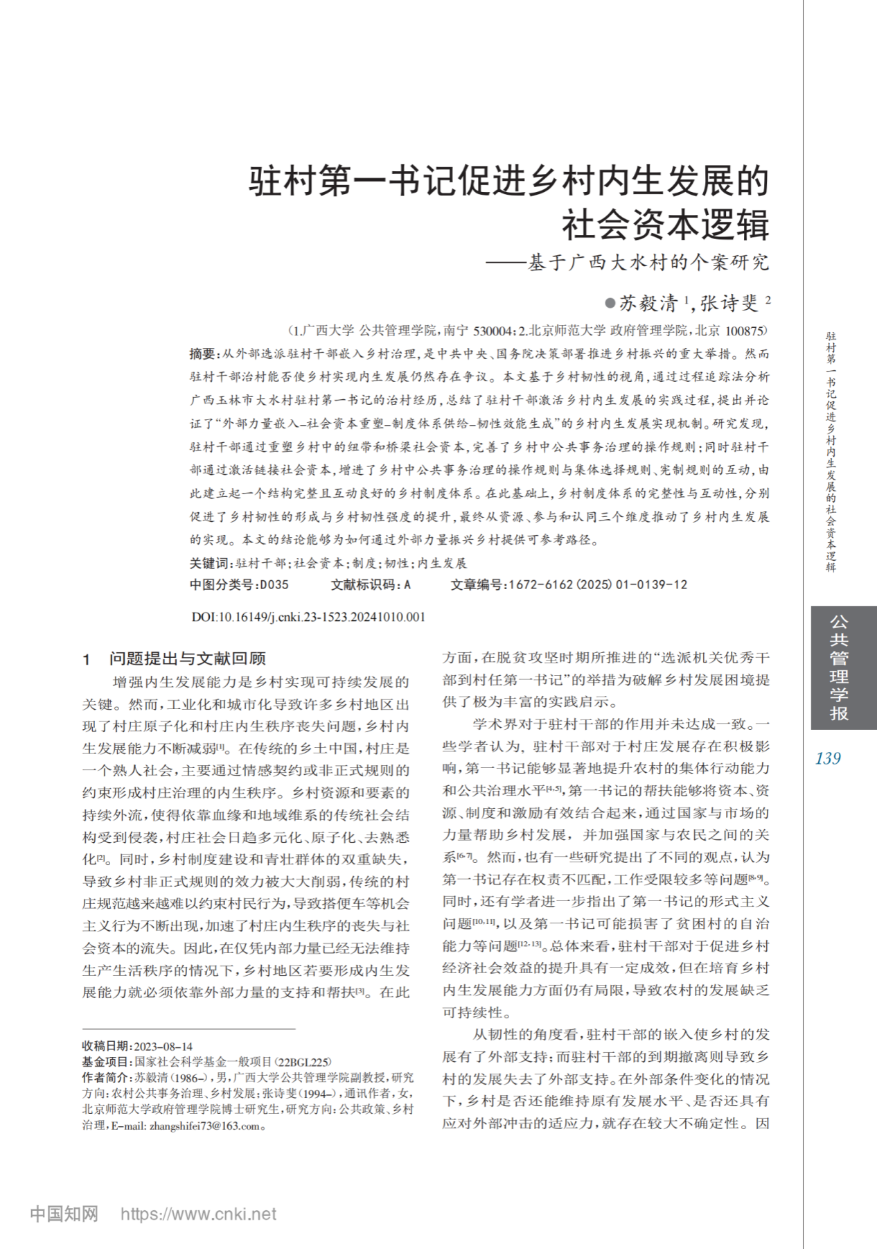 本文的写作灵感,来源于苏毅清副教授于2018年前往广西百色市凌云县后龙村调研时,时任后龙村第一书记跟他说过的一句话:“我人会走,但是我给村庄建立的制度始终都在,人走茶不凉”。从中央政策层面看,从外部选派驻村干部嵌入乡村治理,是中共中央、国务院决策部署推进乡村振兴的重大举措。而在现实中,第一书记的到来也给许多村庄带来了内生发展的挑战,具体表现为:一些村庄并不会因为第一书记的到期离任而影响发展,而另一些村庄却会因为第一书记的撤出而重新陷入发展困境。对此,究竟需要第一书记在任时开展哪些工作,才能使得村庄获得内生发展、自主治理的能力,使得第一书记撤出后村庄依然能够遵循良好的发展轨迹运行呢?对此,苏毅清副教授团队的研究发现,驻村干部通过重塑乡村中的纽带和桥梁社会资本,完善了乡村中公共事务治理的操作规则;同时驻村干部通过激活链接社会资本,增进了乡村中公共事务治理的操作规则与集体选择规则、宪制规则的互动,由此建立起一个结构完整且互动良好的乡村制度体系。在此基础上,乡村制度体系的完整性与互动性,分别促进了乡村韧性的形成与乡村韧性强度的提升,最终从资源、参与和认同三个维度推动了乡村内生发展的实现。论文的结论能够为如何通过外部力量振兴乡村提供可参考路径。