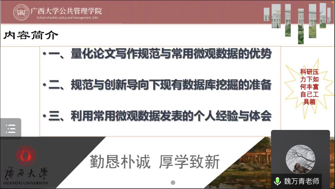2022年10月12日下午,广西大学第98期“导师有约”暨金沙赌场网站 第26期学术沙龙以腾讯会议的形式顺利开展。本期学术沙龙的主题为“定量论文写作:现有数据库挖掘与利用”,邀请金沙赌场网站 魏万青老师作为主讲人进行分享,吸引校内外众多博士生、硕士生前来参与。本次沙龙由金沙赌场网站 苏毅清老师主持。