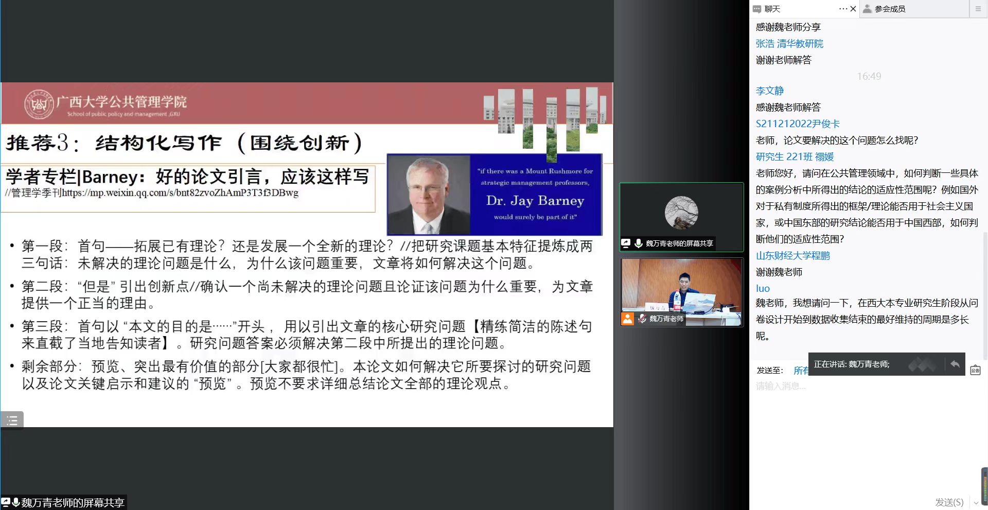 在魏老师讲解结束后,苏老师针对其讲解内容进行总结并邀请参会同学进行提问。魏老师对于同学们提出的“初学者如何练习规范性写作”、“论文中如何嵌入理论”、“看文献过程中不理解数据模型与公式怎么办”等问题进行耐心的解答,解开同学们在论文撰写过程中所产生的一些疑惑。至此,学术沙龙活动圆满结束。