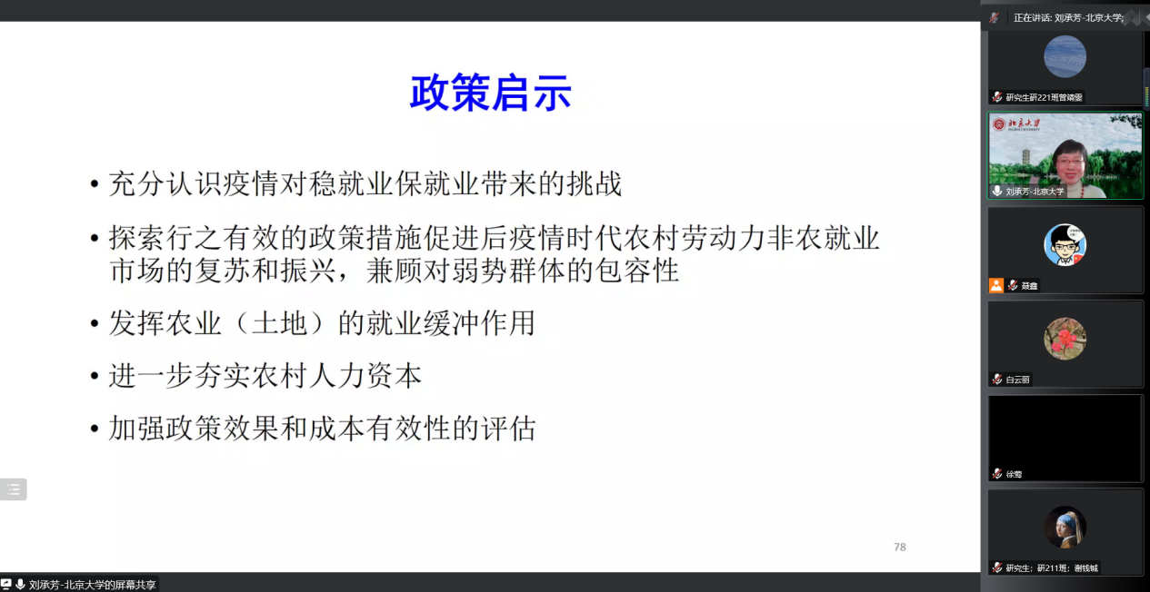 首先,刘承芳教授介绍了本次研究的逻辑思路以及数据样本来源。其次,刘承芳教授通过对数据的分析发现,一是疫情扭转了农村劳动力持续20年的稳步增长态势。在2018年从事非农就业的农村劳动力中,2020年退出非农就业的农村劳动力所占比重为18%,且退出非农就业后,有近三分之二的人返回农业部门;二是对于继续从事非农就业的农村劳动力,其就业行业、就业地点、工作时长都因疫情影响而发生了改变。此外,刘承芳教授指出,调研发现80%的村庄采取了稳就业保就业措施,但运用OLS、PSM、IV作回归分析的结果表明,并不是所有措施都有助于保或稳农村劳动力的非农就业。最后,刘教授提出了此次研究的政策启示。