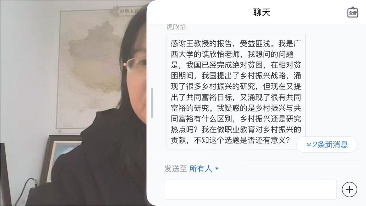最后,王教授与参与讲座的师生开展了线上互动,详细解答师生提出的问题。魏副院长对王教授的精彩讲座致以诚挚的感谢,并邀请王教授到广西大学与西大的师生做面对面的交流。本次学术讲座让师生们更加了解国内外的贫困研究状况,激发了老师们申请国家社科基金的热情,引起了同学们对我国贫困问题的思考和重视,增强了大家的民族使命感和爱国情怀。