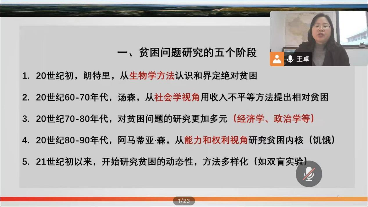 讲座伊始,魏万青教授介绍了王卓教授的工作履历和研究方向,并对王教授的到来表示热烈欢迎。王教授通过贫困与贫困人口引出讲座主题,围绕贫困问题研究的五个阶段、贫困类型学下的相对贫困和社科基金项目研究的体会三个话题展开。王教授阐述了贫困问题研究的五个阶段,并对贫困分析中的绝对贫困、相对贫困、权利贫困、能力贫困进行了具体的讲解,指出在不同的阶段贫困分析的过程是一个动态的过程。