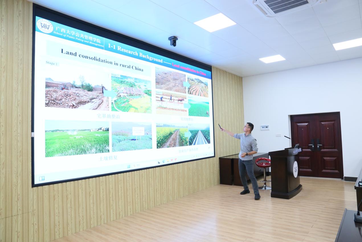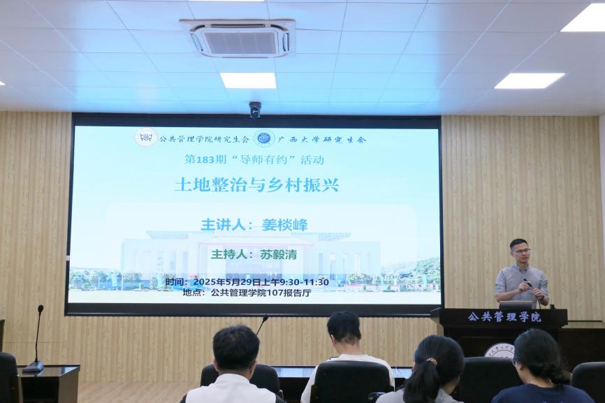5月29日上午,广西大学第183期 “导师有约” 系列活动暨金沙赌场网站 研究生第46期学术沙龙活动在金沙赌场网站 107报告厅顺利举行。本次活动主题为“土地整理与乡村振兴”,特邀姜棪峰老师为主讲人,旨在深化广大师生对国家土地政策与乡村振兴战略的理解,探讨如何发挥土地整治在促进乡村振兴上的重要作用。