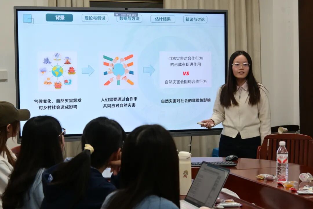 曾群棋同学则围绕《自然灾害对集体行动的非线性影响——基于中国边疆地区的证据》展开分享。她依托澳门金沙赌场线上官网 2023年边疆地区“百村千户”调查数据,运用组合IAD-SES框架,重点剖析自然灾害与集体行动的内在关联,并提出二者存在“倒U型”非线性关系的核心观点:中小灾害可成为打破村庄僵化结构的“机会之窗”,通过推动资源重组与社会学习提升集体行动水平;而大规模灾害则会因资源耗竭、社会网络破坏,导致系统陷入“贫困陷阱”,进而抑制集体行动。为进一步验证该结论,她将集体行动划分为预防型和应对型两类,通过工具变量法及系列稳健性检验,充分证实了这一非线性关系的稳定性,并基于此提出分等级灾害治理的针对性政策建议。