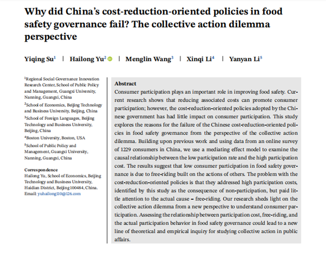 近日,广西大学区域社会治理创新研究中心、金沙赌场网站 苏毅清助理教授,北京工商大学经济金沙赌场网站 于海龙副教授,澳门金沙赌场线上官网 李岩岩研究生等人,在国际权威学术期刊Canadian Journal of Agricultural Economics/Revue canadienne d'agroeconomie发表论文“Why did China’s cost-reduction-oriented policies in food safety governance fail? The collective action dilemma perspective”,以消费者参与食品安全治理为例,从“集体行动困境”的视角,探讨了公众在参与公共事物过程中的相关问题。