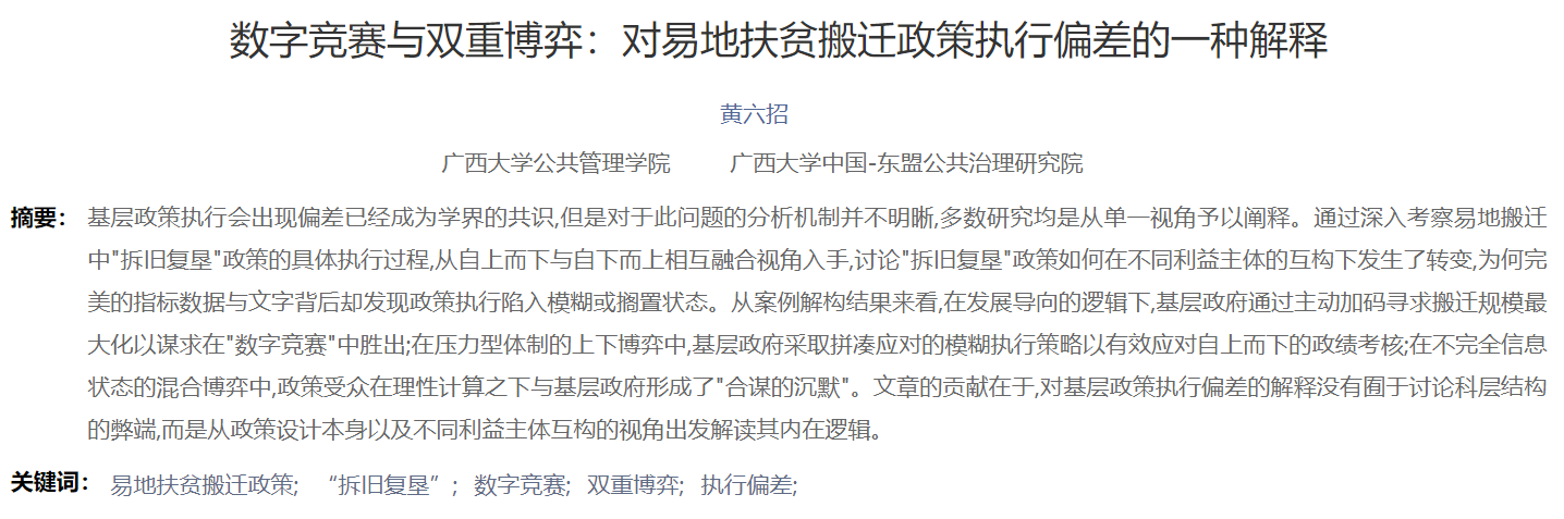 黄六招.数字竞赛与双重博弈:对易地扶贫搬迁政策执行偏差的一种解释[J].理论与改革,2022(01):102-116+158.