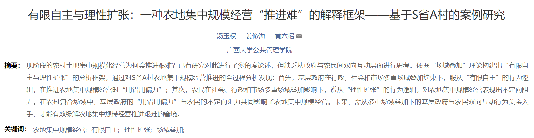 汤玉权,姜修海,黄六招.有限自主与理性扩张:一种农地集中规模经营“推进难”的解释框架——基于S省A村的案例研究[J].重庆社会科学,2022(02):6-22.