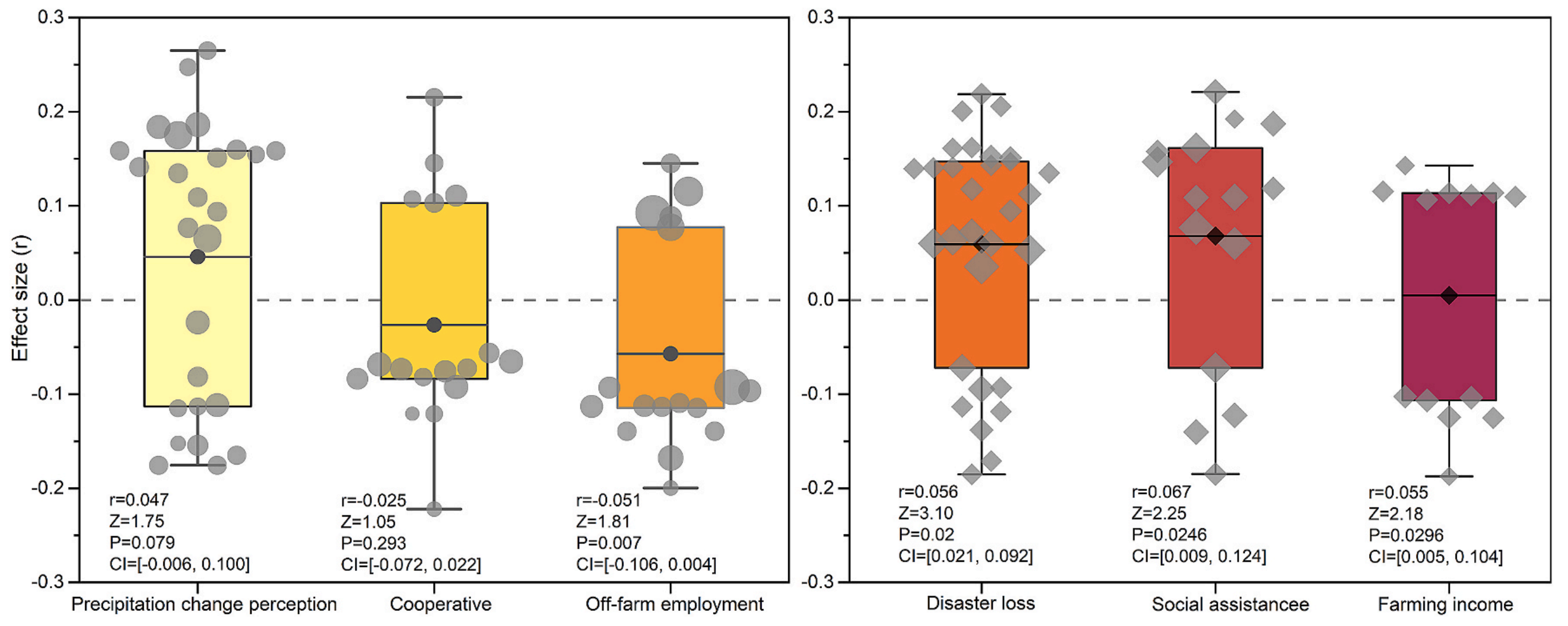 实证结果表明,农民对降水变化的感知往往不准确,而感知、经验、风险态度等其他心理因素对其适应行为有显著的正向影响(图2)。不同气候区域是气候变化感知高异质性的主要来源,因此气候区域的影响可能是削弱气候变化感知与适应行为之间正相关关系的调节因素。此外,本研究还强调,需要在家庭层面进行干预,以提高农民对气候变化的适应能力。这包括通过收入多样化、预警信息服务、培训、援助、信贷、补贴和其他资源提供支持。未来,应加强对感知、经验和风险如何相互作用影响适应行为的机制的研究。