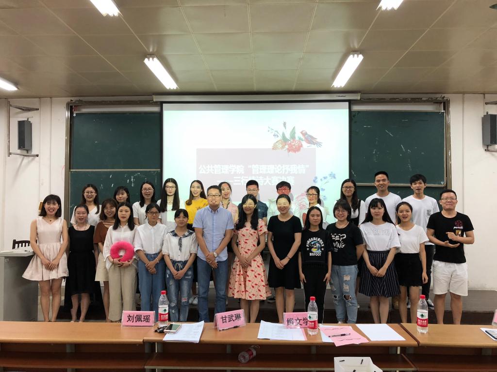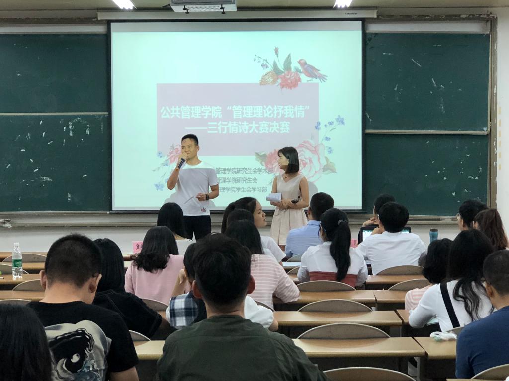 5月2日19时30分,金沙赌场网站 203教室正在进行金沙赌场网站 "管理理论抒我情"三行情诗大赛决赛。参与本次大赛的有评委甘武琳副书记、 社工系缑文学副主任、人教系陈曦萌老师、刘佩瑶老师,到场的还有18名决赛选手及各班派出的观赛同学。