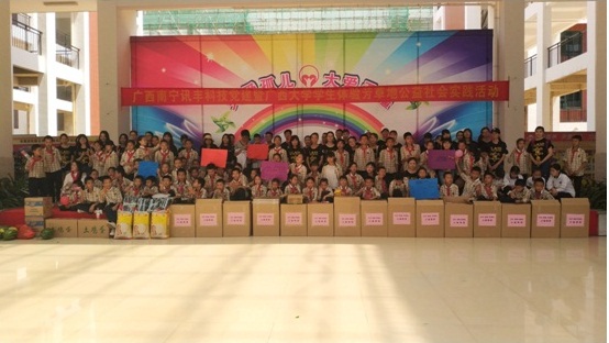 学生创新志愿服务形式和载体,5月26日上午,在广西南宁讯丰网络科技有限公司党支部、广西芳草地贫困儿童助学服务中心,以及西乡塘区工商联和团委的大力支持下,公共事业管理专业2016级的同学在到位于南宁市西乡塘区的明天学校开展了主题为“爱心公益·欢乐六一”的公益社会实践活动。本次社会公益实践活动,不仅让大学生参与了志愿服务,尽一份力所能及的责任和担当,更是帮助了弱势群体,为社会增添一份温暖,进一步弘扬社会正能量。