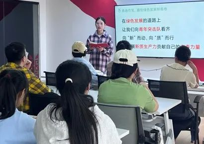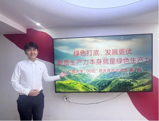 本次主题党日活动特别邀请广西大学“00后”君武青年讲师团成员周洋舟作主题宣讲。周洋舟从新质生产力的概念提出导入宣讲主题,通过上林县绿色发展案例精讲来介绍新质生产力的内涵特征和发展重点,引导支部同志深入学习贯彻习近平总书记对广西“五个更大”重要要求。