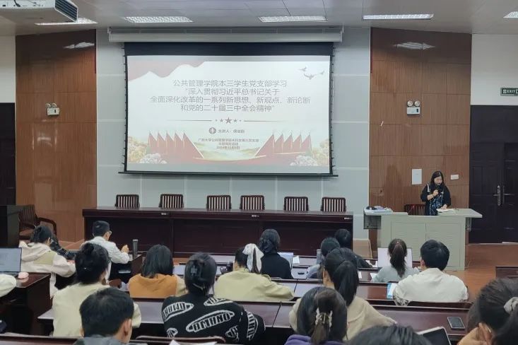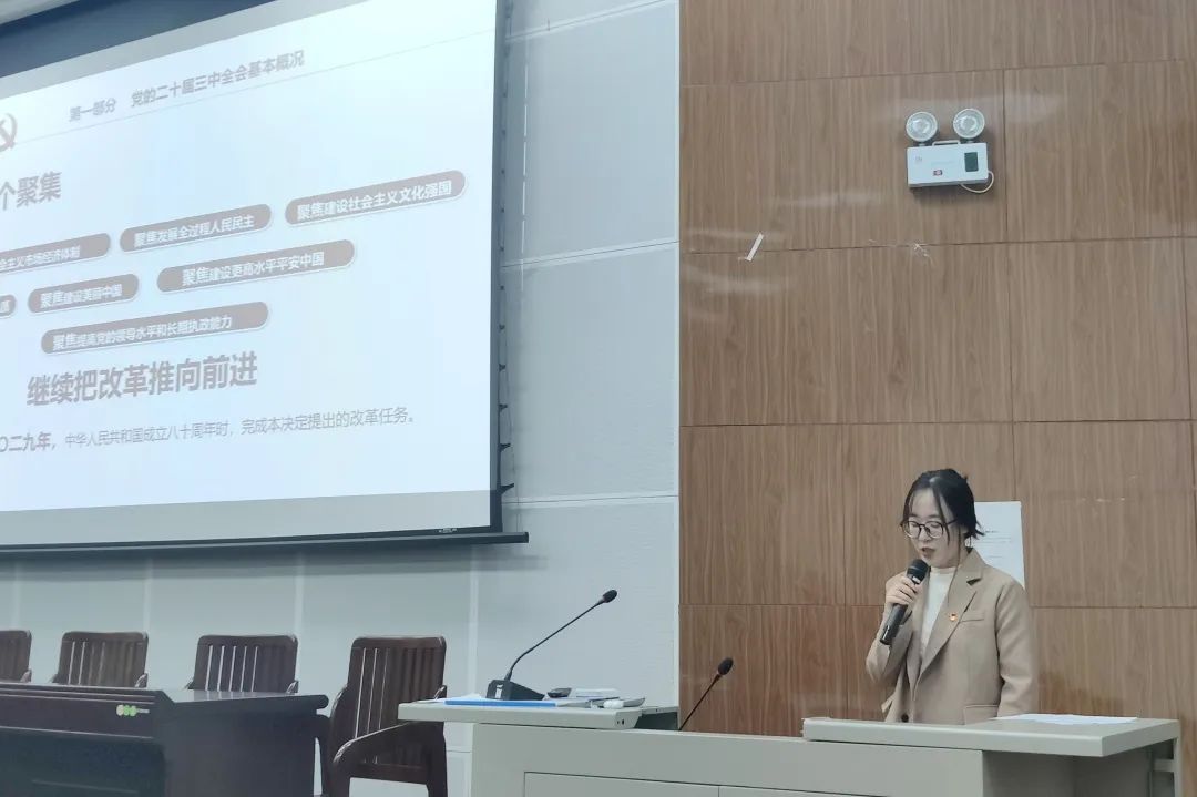 随后,支部党员围绕习近平总书记在党的二十届三中全会上的重要讲话精神与全面深化改革的新思想、新观点、新论断进行主题分享。陈爰熹分享了“守正创新、文化自信——深化文化体制机制改革”的内容,她强调文化体制机制改革的重要性,以及如何在守正的基础上进行创新,增强文化自信。李嘉怡分析的主题是“凝聚改革共识、激发奋进力量”,让同学们深刻认识到凝聚共识对于推动改革的重要性,以及如何将这种力量转化为实际行动。石伊荞以福建省武夷山国家公园的生态建设创新发展路径为例,分享了“凝聚改革共识,激发奋进力量”的具体实践,使大家更加直观地理解了改革在实际中的作用和成果。