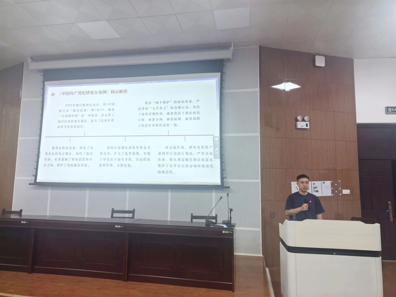 随后,支部宣传委员林文韬同志带领大家专题学习修订的《中国共产党纪律处分条例》和中央八项规定及其实施细则精神。在学习中他强调“两个维护,七个有之”,聚焦务实、为民、节俭,直指作风顽疾,并紧密结合近年来发生的实际违纪案例,通过以案说纪、以案说法,深刻剖析了违纪违法的思想根源和严重危害。这种理论与案例相结合的方式,使全体同志对党的纪律要求有了更直观、更深刻的理解,进一步强化了“知敬畏、存戒惧、守底线”的纪律意识。