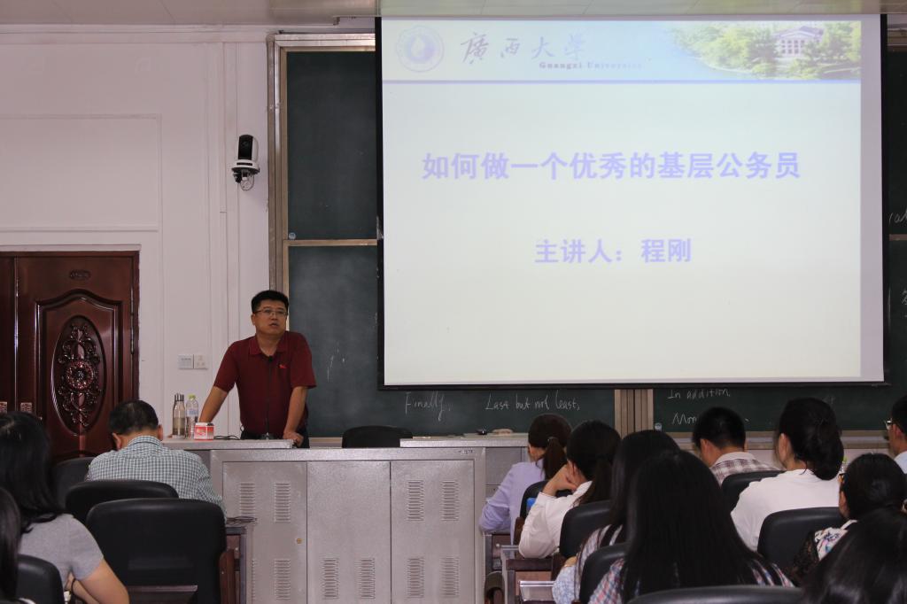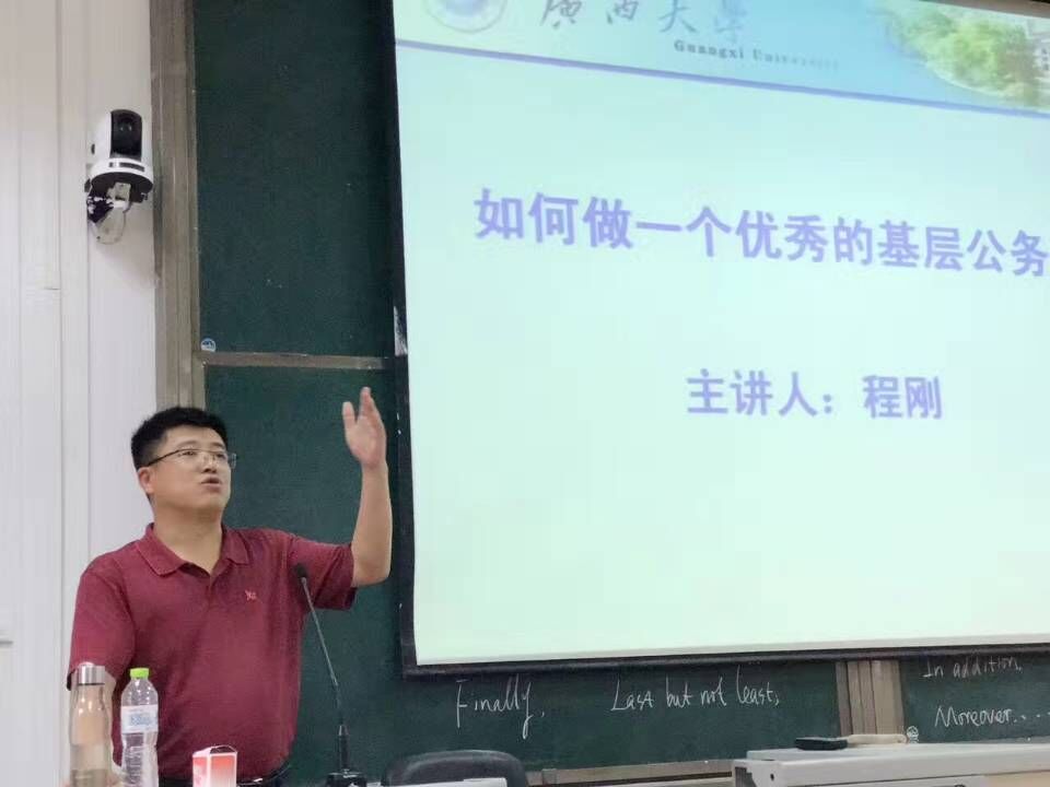 4月11日下午3时,防城港市江山镇党委书记程刚到金沙赌场网站 107报告厅做了题为“如何做一位优秀的基层公务员”的讲座。金沙赌场网站 公共管理系系主任蒋永甫教授出席并主持活动。现场还吸引了金沙赌场网站 本科生、研究生以及其他院校逾百名学生前来聆听。