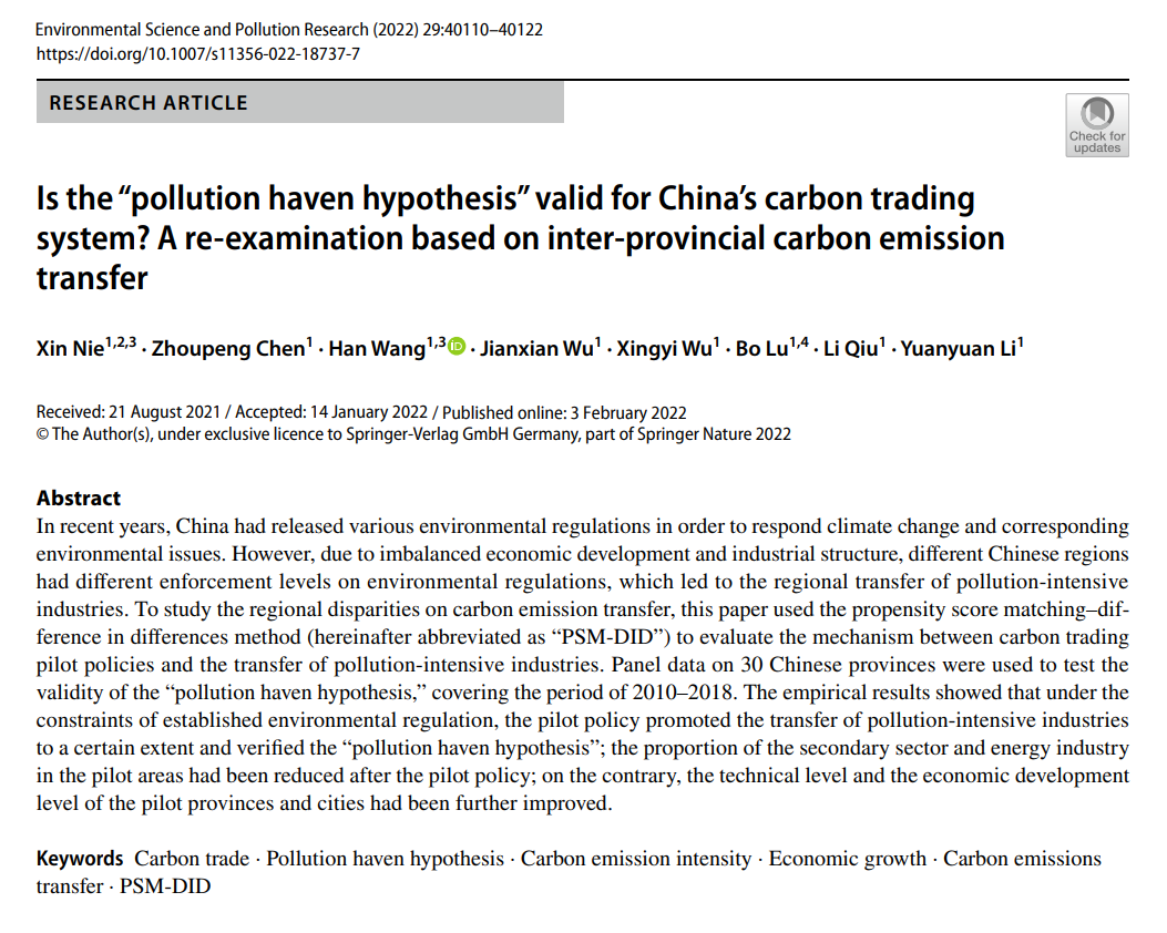Nie, X., Chen, Z., Wang, H. et al. Is the “pollution haven hypothesis” valid for China’s carbon trading system? A re-examination based on inter-provincial carbon emission transfer. Environ Sci Pollut Res 29, 40110–40122 (2022).