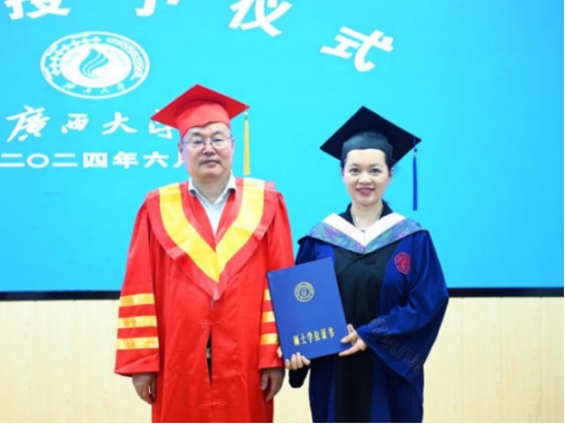 On the morning of June 27, the School of Public Policy and Management at Guangxi University held its graduation ceremony and degree conferral for the 2024 class of Master of Public Administration (MPA) graduates in Room 203 of the school’s lecture hall. The ceremony was attended by more than 200 people, including Dean Shi Yungui, Vice Deans Zhou Junxu, Zeng Fanjun, Qin Zhimin, Chen Lin, Professors Luo Shujie and Li Changzhen, faculty representatives, all graduating MPA students, and their families. The event was presided over by Deputy Party Secretary Yu Dan.